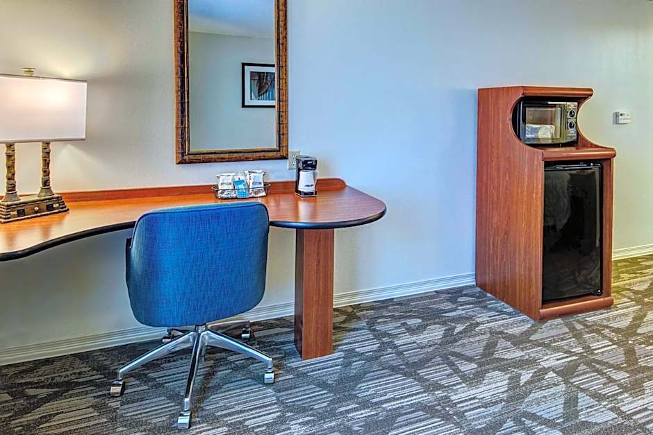 This spacious room features a 32-inch flat-screen cable TV, microwave, and small refrigerator. A desk with an ergonomic chair is also included.